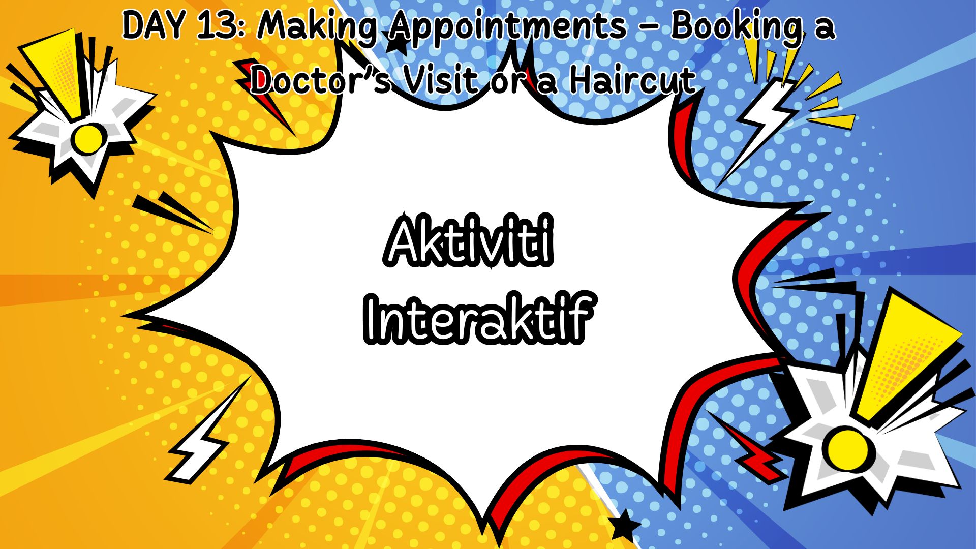 Hari ini, kita akan belajar: Frasa penting untuk membuat temu janji di klinik atau salon. Cara bertanya tentang waktu yang tersedia dan memberikan maklumat peribadi. Membina perbualan asas untuk membuat temu janji dalam situasi sebenar. Mengapa Pelajaran Ini Penting? Membantu anda membuat temu janji dengan yakin di hospital, klinik, atau salon. Membantu dalam perbualan telefon atau ketika bercakap dengan penyambut tetamu. Memudahkan anda menguruskan masa dan memahami pilihan yang tersedia. Nota Motivasi: "An appointment well planned is half the job done!"